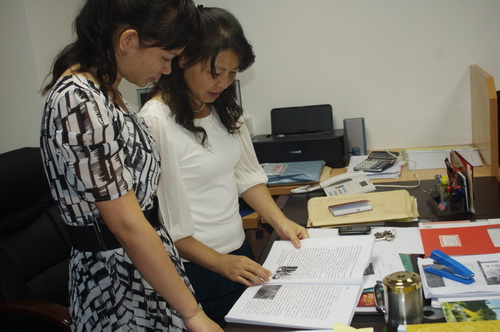 開平市府方志辦譚月園主任(右)與工作人員對《生金記》進行校編