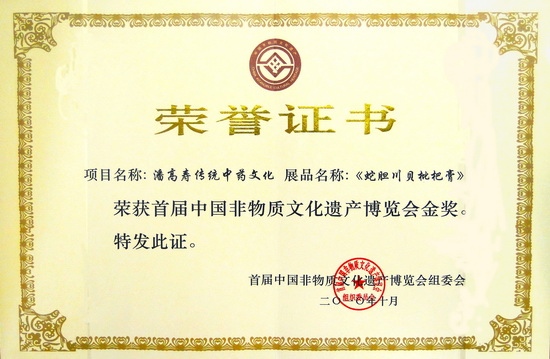 12月16日,在廣州市非物質(zhì)文化遺產(chǎn)工作會議上,我司名牌產(chǎn)品“蛇膽川貝枇杷膏”獲頒“首屆中國非物質(zhì)文化遺產(chǎn)博覽會金獎”。