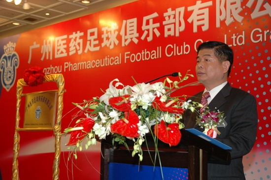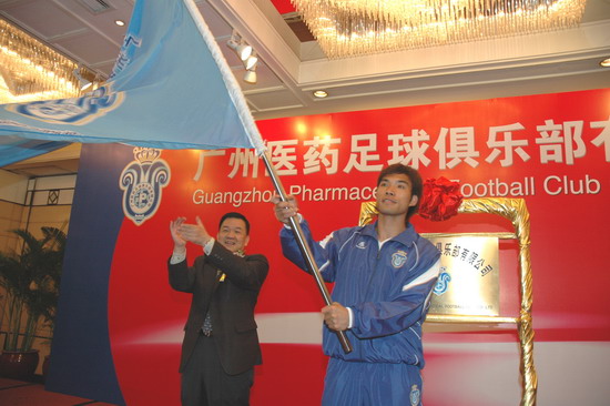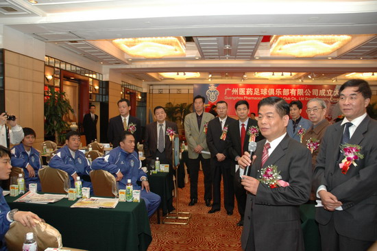 楊榮明董事長認為,廣藥與廣州足球的“聯(lián)姻”可以說是醫(yī)藥文化與足球文化的有機結(jié)合。足球運動本身與醫(yī)藥的追求始終都是為了健康,強強融合,勢不可擋。廣藥從經(jīng)營角度而言,是實施品牌戰(zhàn)略需要。廣藥集團作為廣州國企中龍頭企業(yè),經(jīng)濟實力雄厚,屬下20多家企業(yè)達數(shù)百個產(chǎn)品。去年廣藥集團確定了立足廣東,“西進、北上、東擴”的新戰(zhàn)略。參與足球就是借足球這一全球影響力最大的項目,把廣藥推向全國以及國際。“我們注資足球是回饋社會的一種方式。廣藥這次“涉足”,不是贊助,而是投資——俱樂部注冊資金達2000萬元。我們在著力打造中國制藥業(yè)的艦?zāi)傅耐瑫r,也將全力打造足球這塊城市的名片”楊榮明解開了廣藥集團參與足球之迷,顯然是動真格的。當(dāng)天,廣藥足球隊全體將士身穿藍色(廣藥CI設(shè)計主色調(diào))隊服,讓人們眼前一亮,尤其隊徽,別有新意。“隊徽圖案整體取廣州市木棉花的形狀;花托為一對羊角,隱喻羊城,花中心為廣藥LOGO,花蕊是皇冠,寓意廣州隊問鼎中國職業(yè)足球啊。在此,首先祝你們沖超成功”。楊榮明董事長對在座的廣州足球運動將士興致勃勃地解說新隊徽,并給他們打氣。